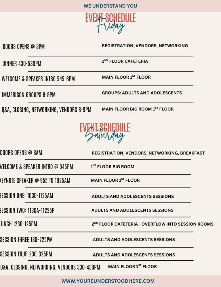The We Understand You Summit is a trauma-informed gathering focused on awareness, education, and connection for trauma survivors of trauma or mental health. Through speakers, experiential sessions, and community support, the summit creates space for understanding, healing, and hope.